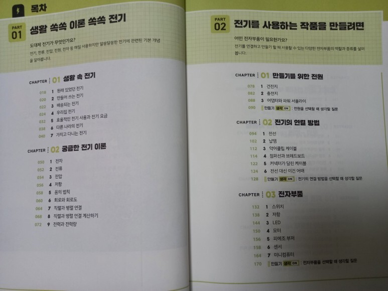 PART2 <전기를 사용하는 작품을 만들려면>에서는 어떤 전자부품이 필요한지에 대해서 배운다, 주로 전기를 연결하고 만들기 할 때 사용할 수 있는 다양한 전자부품의 역할과 종류를 살펴본다.