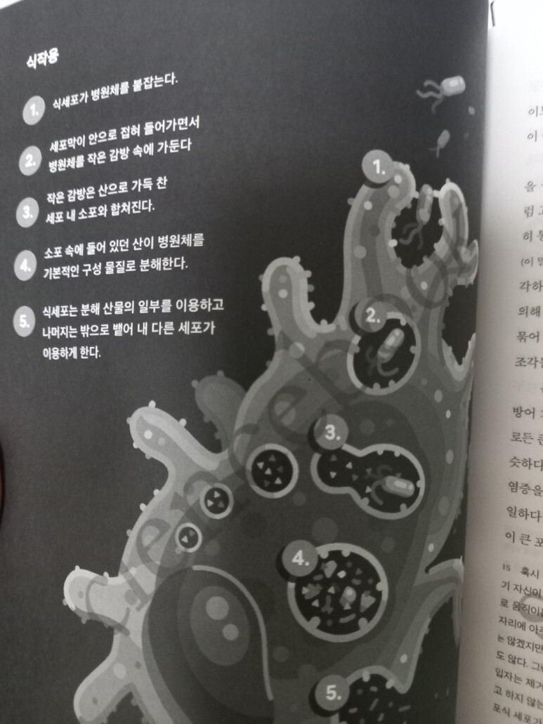 이 책은 어려운 <면역>이라는 내용과 어려운 단어들을 이해하기 쉽게 적절한 비유와 예시를 들어서 설명한다. 그리고 그래픽(시각적인 자료)과 진행 과정을 번호로 순서 매긴 그림들이 있어서 우리의 면역계를 이해하는 데 도움을 준다. 또 이 책은 가벼워서 휴대하기가 편해 언제 어디서나 읽기에 좋다. 또 중요한 문장이나 단어는 진한 색이 칠해져 큰 글자로 되어 있어서 다시 찾아보기 편리하며 책 아래 주석들이 추가 설명을 해주어서 추가적으로 더 많은 정보를 얻을 수 있다.